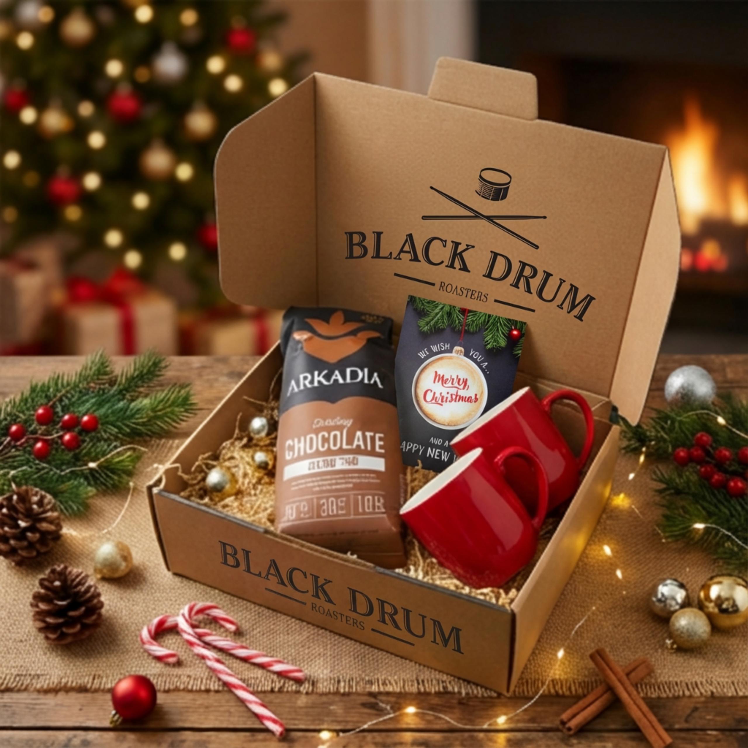 Limited-edition Merry Drum Chocolate Gift Box with Arkadia Drinking Chocolate Blend No. 20 and two festive red mugs β ready to gift, no wrapping needed.