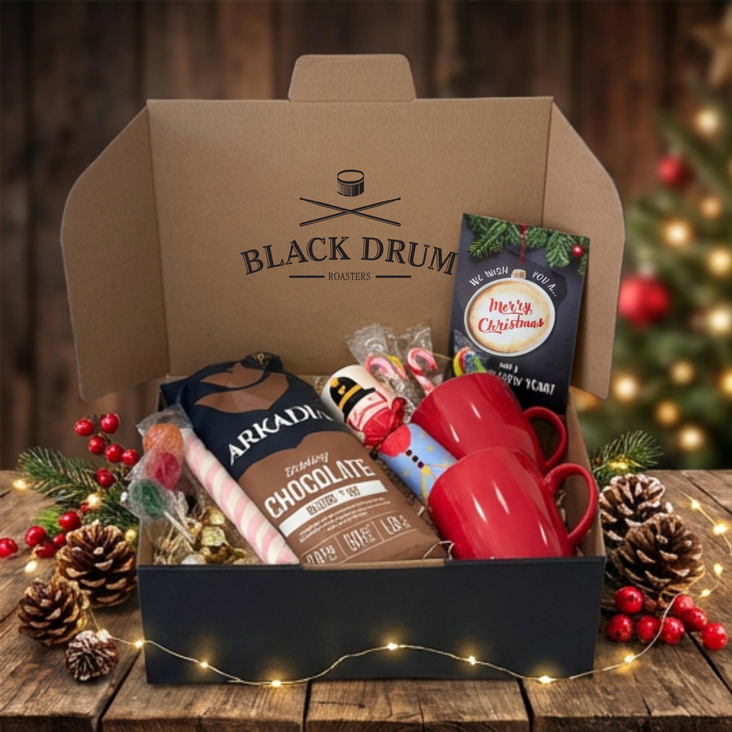 Limited-edition Merry Drum Chocolate Gift Box with Arkadia Drinking Chocolate Blend No. 20 and two festive red mugs – ready to gift, no wrapping needed.